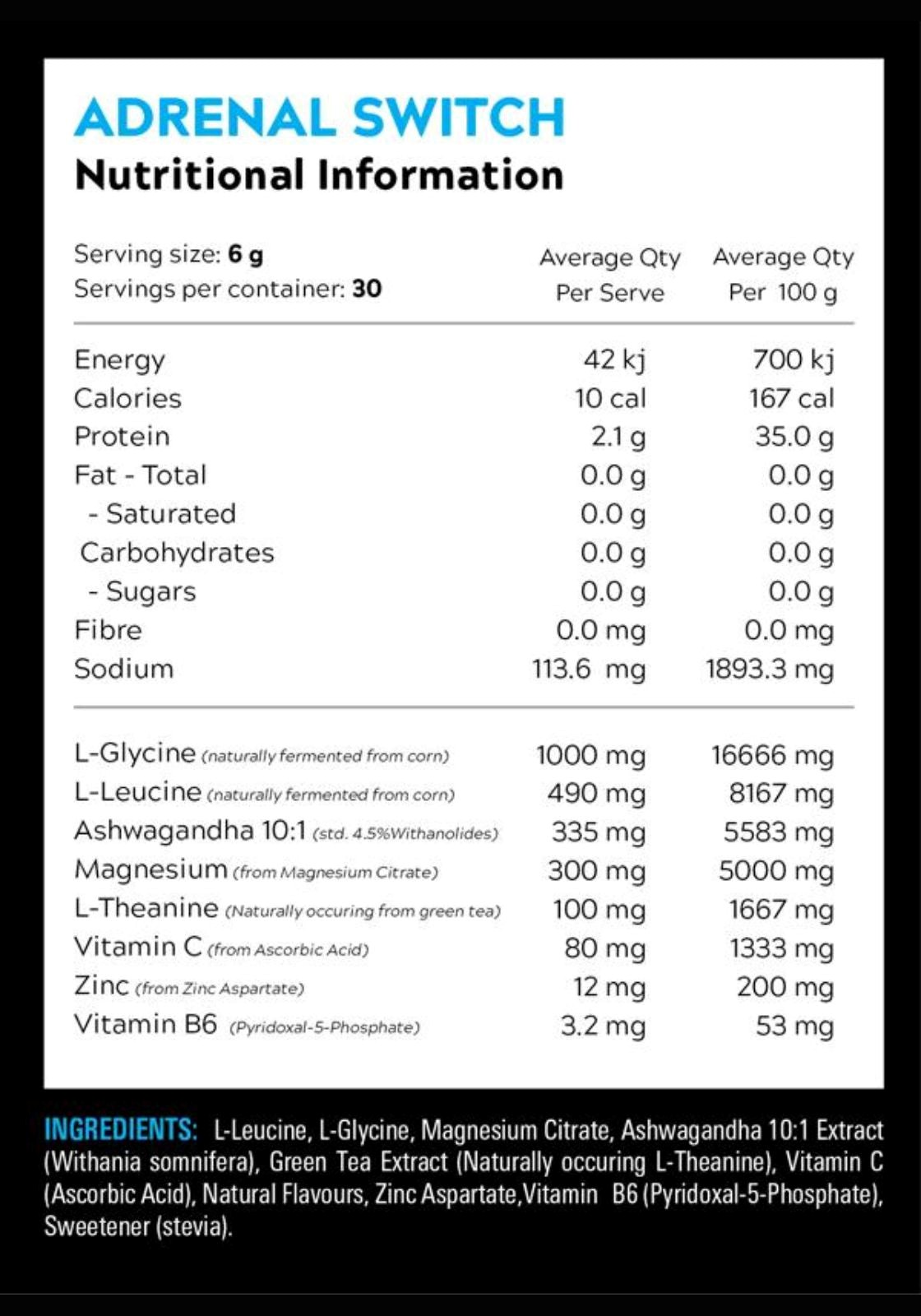 Their advanced formula includes a high dose of Magnesium, known for its ability to reduce muscle cramps and support optimal muscle function. Combined with Ashwagandha, which helps manage cortisol levels and combat stress, and L-Glycine to promote restful sleep, Adrenal Switch is the perfect post-workout solution to enhance recovery and unwind from the day’s challenges. Additionally, ingredients like L-Leucine and Camellia Sinensis provide powerful antioxidant and recovery benefits, ensuring your muscles get the support they need.