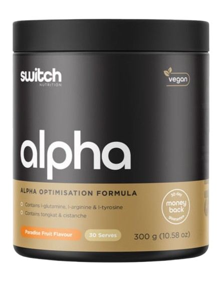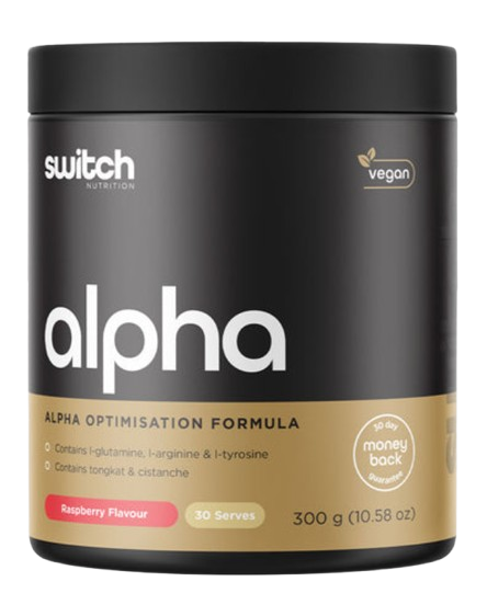 Alpha Powder by Switch Nutrition is a premium powdered supplement featuring a comprehensive blend of amino acids, traditional herbal extracts, fulvic mineral complex, and essential nutrients designed to support general male wellness.
