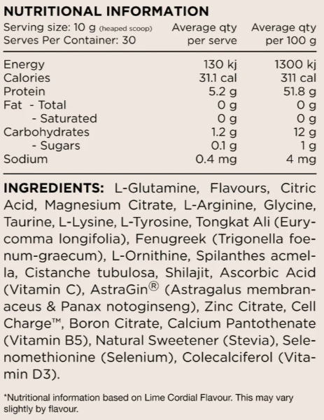 • Contains a targeted amino acid profile including L-Glutamine, L-Lysine, L-Arginine, Glycine, Taurine, L-Ornithine, and more