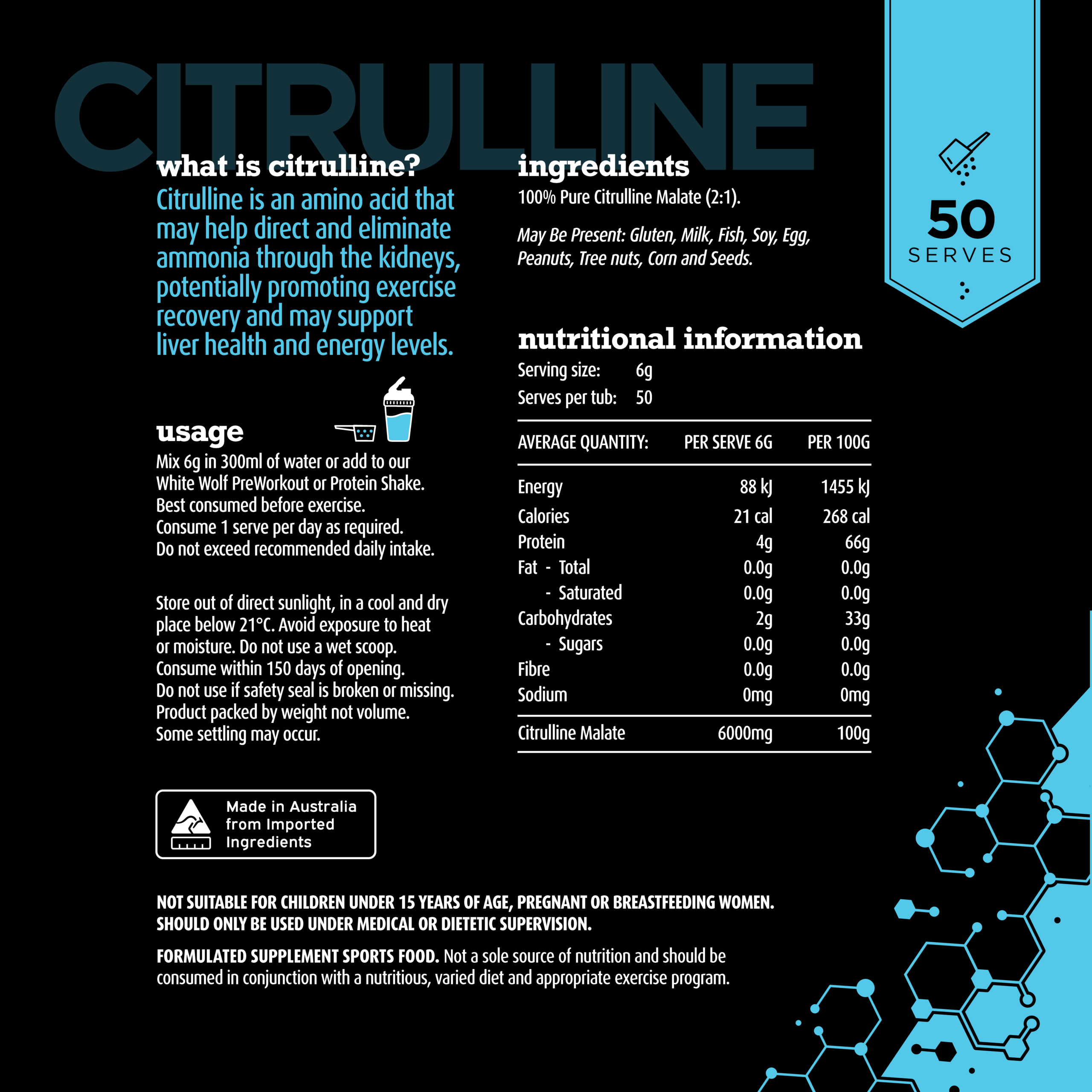 Whether you’re chasing better pumps, endurance, or recovery, our pure Citrulline is unflavoured and easy to mix into water, pre-workout, or your favourite protein shake – best enjoyed before exercise!