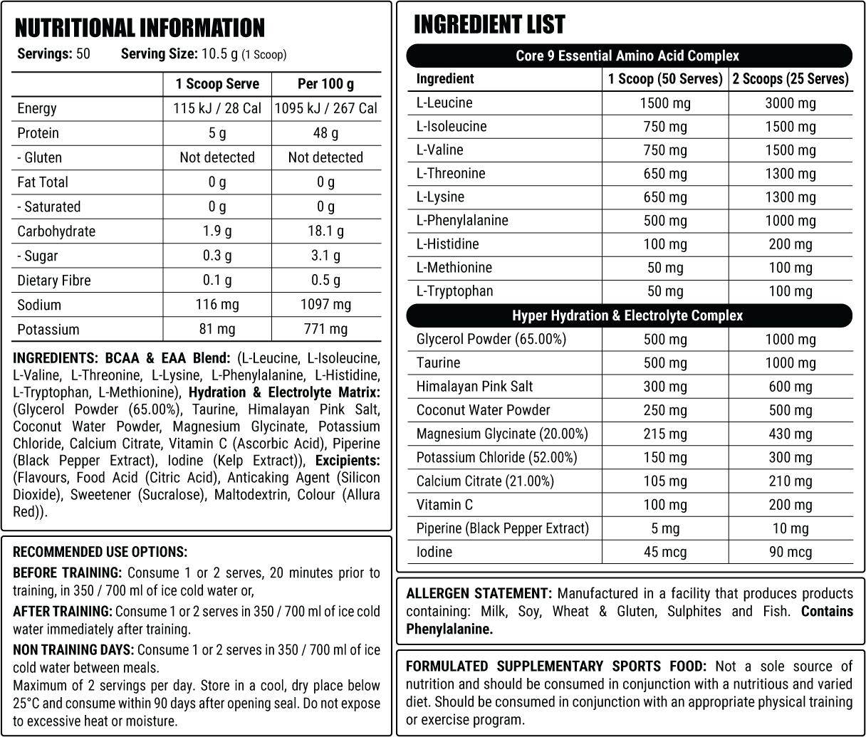 Faction Labs Amino Acid Complex is dripping with EAA’s and BCAA’s. Core 9 also contains a General Health Matrix and comprehensive electrolyte blend. Elevate your training with Faction Labs Core 9.