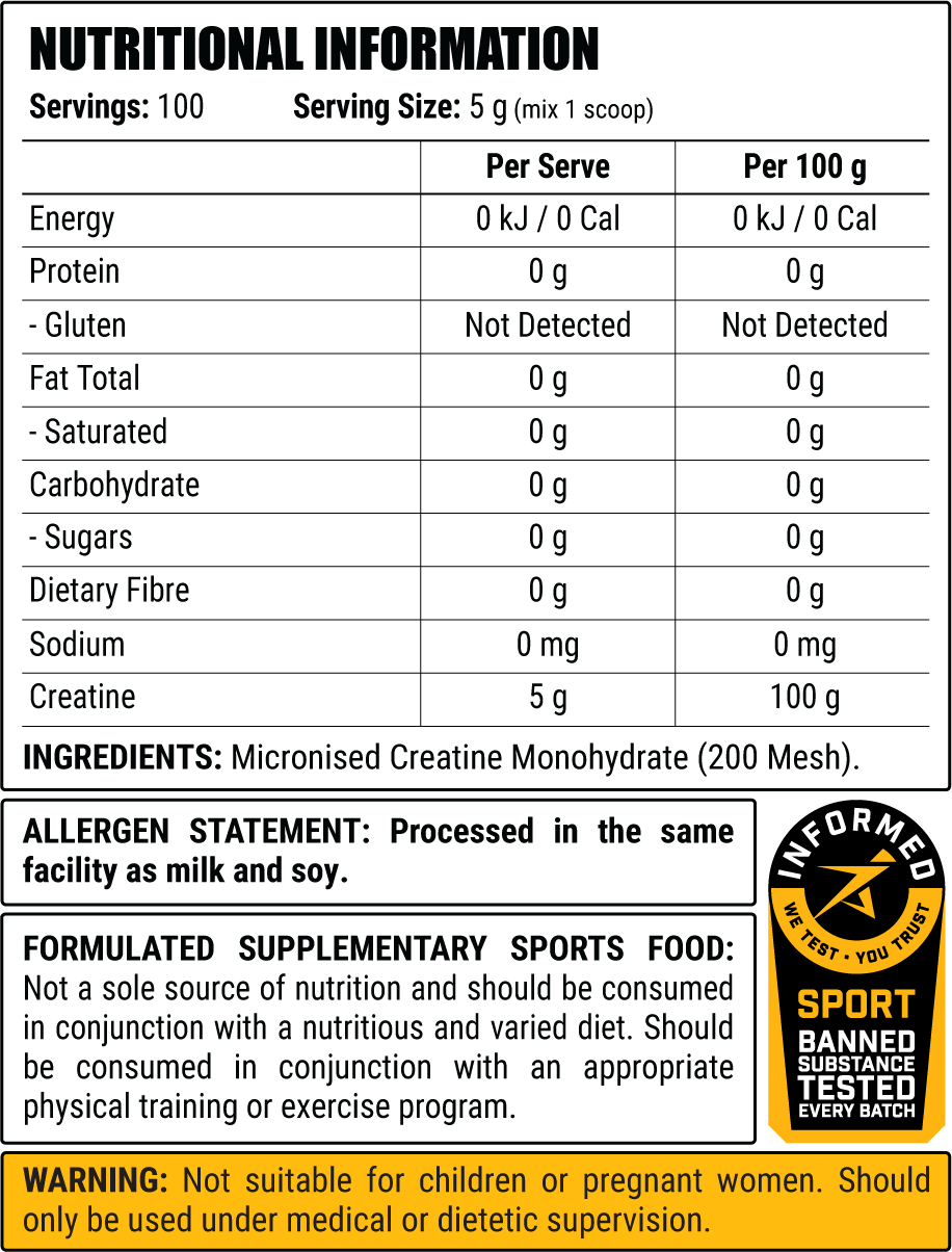 - 100% creatine monohydrate – open label, no fillers