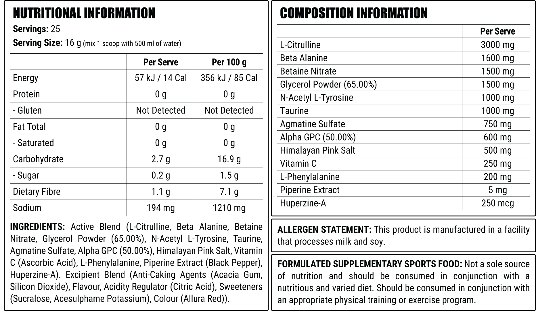 Disorder Pump is a stimulant-free pre-workout supplement formulated to support training sessions. Each serving includes L-Citrulline, Beta-Alanine, agmatine, and electrolyte compounds to assist hydration, focus and vascular support when used prior to exercise. Stacked to the teeth with Nootropics with a huge 600mg Alpha GPC per serve!