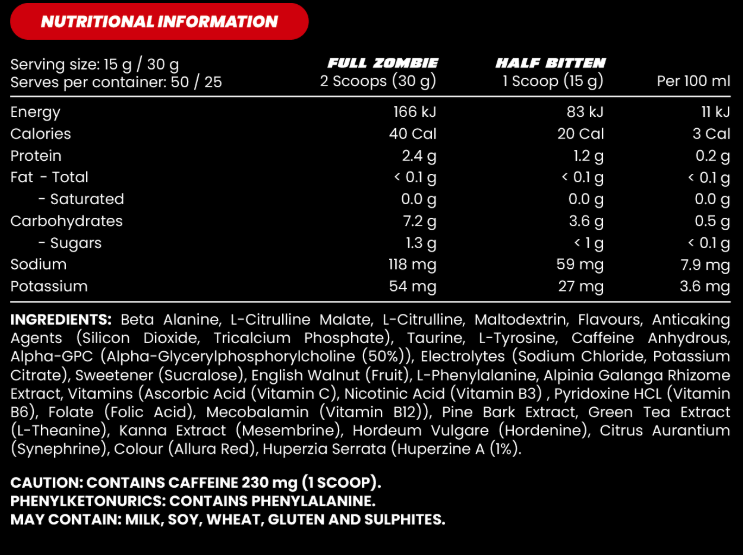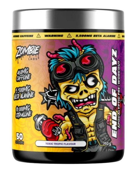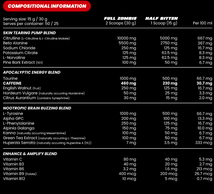 End of Dayz is Zombie Labs flagship preworkout built for gruelling gym sessions! This is what we class as a 2.0 Pre, where the formula has a major increase in muscle pump focused based ingredients. Double Scoop for the full End of Dayz experience (warning very high levels of caffeine – not for the faint hearted or inexperienced) or a single scoop for a good pump matrix that rivals regular pre’s without the insane 300mg+ of caffeine like most (great for a simple single scoop user that wants a boost without the stupidly high stim). A double scoop of Zombie End of Dayz contains key ingredients like: