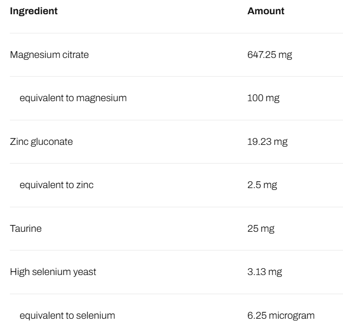 Contains a formulated combination of Magnesium Citrate + Zinc Gluconate + Organic Selenium + Taurine